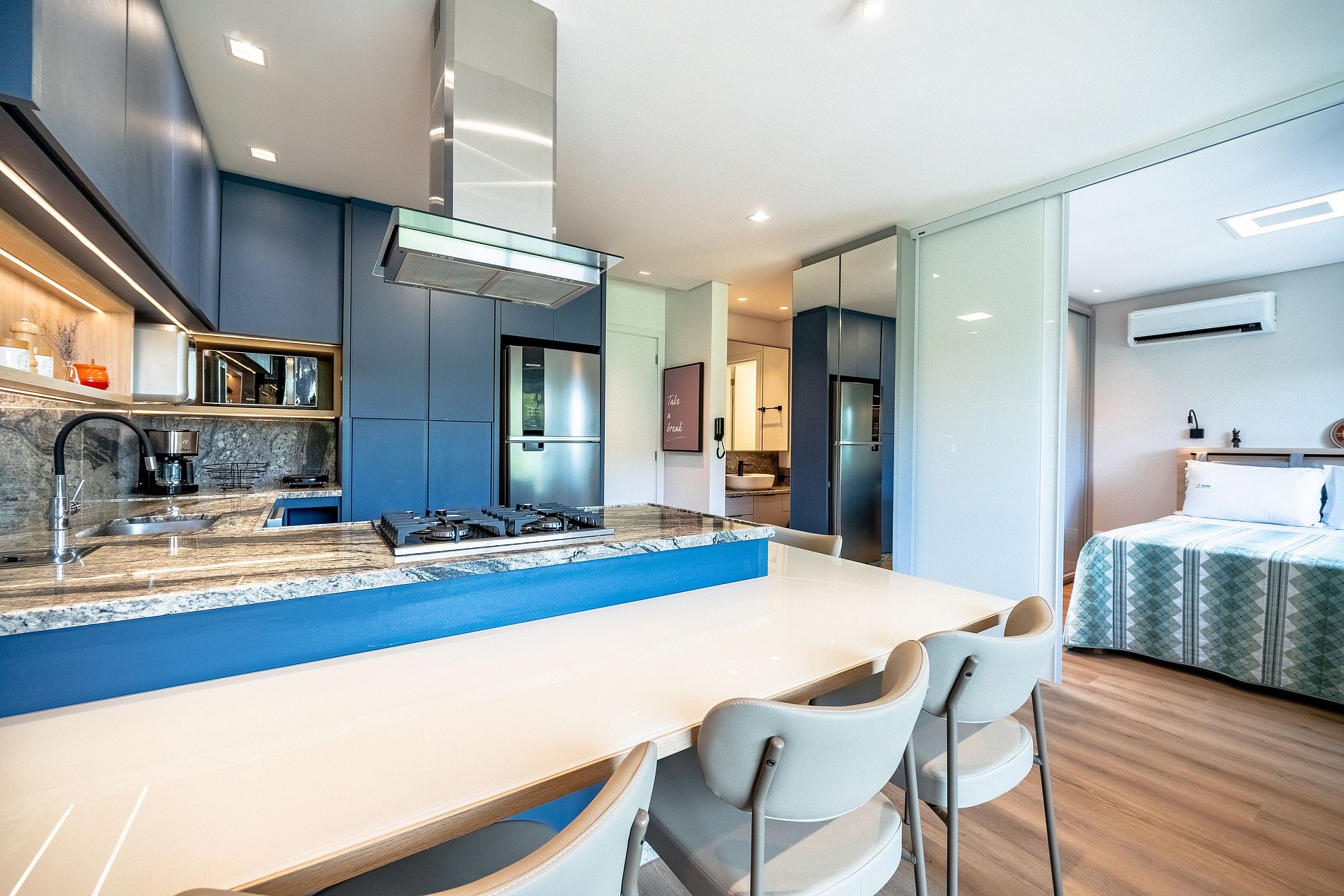 Apartamento perfeito de 1 dormitório que oferece privacidade e conforto, acomodando até 4 pessoas com uma cama de casal no quarto e um sofá-cama de casal na sala. A cozinha completa dispõe de filtro, micro-ondas, airfryer/forno, lava-louças, cafeteira e utensílios essenciais. Conta ainda com banheiro moderno, ar-condicionado quente/frio em ambos os ambientes, Smart TV na sala e Wi-Fi fibra óptica. Para momentos na praia, dispõe de cadeiras e guarda-sol.